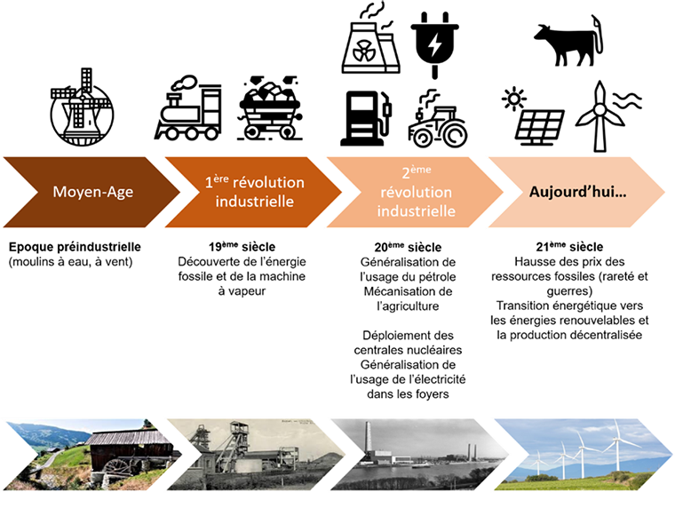 • Avec la révolution industrielle du XIXe siècle et jusqu’au lendemain de la seconde guerre mondiale, la production énergétique a commencé à être dissociée de son lieu de consommation. L’avènement du charbon, puis des produits pétroliers, a permis de développer de nouvelles formes d’industries, de nouvelles manières de penser l’aménagement du territoire, intégrant notamment le développement des infrastructures terrestres (ferroviaires, routières, lignes à haute tension, gazoducs...) mais aussi l’organisation des villes et métropoles, des espaces de production, voire des espaces de loisirs.